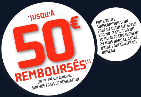 NRJ Mobile vous rembourse jusqu’à 50€ sur vos frais de résiliation pour toute souscription à un forfait Ultimate Speed 500Mo, 2Go, 5Go ou 10Go et jusqu’à 30€ remboursés avec un forfait Ultimate Speed 30min, 1h ou d’une offre bloquée Be Live.