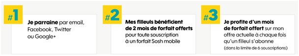Opération de parrainage par Sosh ouverte en France métropolitaine à compter du 02/10/2014 jusqu'au 19/11/2014 pour toute souscription sur le web. Opération valable entre deux individus distincts. Le parrain doit être détenteur d'une offre Sosh mobile ou Sosh mobile + Livebox souscrite au minimum 1 mois avant le début de l'opération de parrainage.