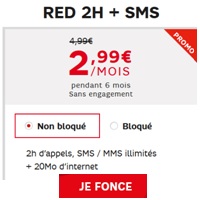 Le forfait 2h au prix de 4.99€ par mois en promo à 2.99€ pendant 6 mois comprend 2h d’appels par mois ainsi que les SMS et MMS illimités, un accès Internet de 20Mo par mois et SFR Wifi illimité. Pour l'Internet sur mobile, une recharge de 20 Mo d'un montant de 1€ est automatiquement déclenchée dès épuisement des 20Mo. Une alerte SMS vous est envoyée avant le déclenchement de la recharge et dans la limite de 4 rechargements de 20 Mo maximum par mois sinon possibilité d’ajouter l’option 2Go à 10€ mois. Sans option de blocage, le prix de la minute en France métropolitaine au-delà du forfait est de 0,10€