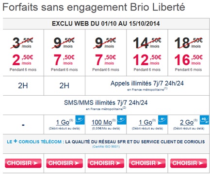 Pour toute souscription entre le 01 et 15 octobre prochain, Coriolis vous offre 1€ sur le forfait 2H à 3.50€ et 2€ sur toutes les autres formules sans engagement. La remise est automatique et valable pendant 6 mois, en cas de changement vers un forfait Coriolis avec engagement, la promotion n’est plus appliquée.