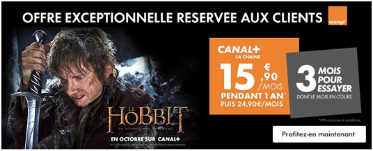 Profitez des chaines de canal + et CanalSAT à 19,90€/mois pendant 1 an, puis 39,90€/mois. Cette promo est valable du 15 octobre au 12 novembre 2014 pour tout nouvel abonnement d'un an (toute personne non abonnée au cours des 6 derniers mois). Promos valables en France métropolitaine, avec un engagement de 12 mois, sous réserve d’éligibilité technique particulière, réservées aux abonnés internet Tv téléphone ORANGE. Pour les abonnés ORANGE dont la Tv est desservie par satellite, les offres CANAL+/CANALSAT et options FOOT+ et RUGBY+ sont accessibles uniquement avec la parabole orientée vers le satellite Astra.. Offres et promotions valables hors abonnement et couts lies aux offres internet haut débit ORANGE (forfait internet+Tv numérique), options, dépôt de garantie du décodeur Tv (49€), location de la Livebox (3€/mois) et achat de programmes a la demande. Frais d’accès aux Chaînes CANAL+: 50€. Tout changement de mode de réception ou d’operateur ADSL entraine l’annulation de la promotion. Offres non cumulables avec toutes autres offres promotionnelles en cours. Les chaines FOOT+/ RUGBY+ sont aussi offertes pendant 3 mois.
