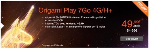 Le forfait Origami Play 7Go est en promotion à 49.99€ au lieu de 54.99€ avec achat de mobile et engagement de 24mois ou encore à 54.99€ au lieu de 60.99€ avec un engagement de 12 mois. Cet abonnement intègre les appels, SMS/MMS illimités vers les fixes et les mobiles en France et vers les DOM. Vous profitez d’un accès Internet de 7Go en 4G (débit réduit au-delà) ainsi que de 10Go de stockage en ligne avec le cloud d’Orange, le multi-Sim, la ligue 1 et 30 chaînes TV. Pour les communications vers l’international, vous bénéficiez des appels illimités vers les fixes de plus de 100 destinations internationales. Pour vos usages depuis l’international, vous profitez des SMS émis et reçus en illimité, de 3h d’appels depuis l’Europe, la Suisse/Andorre et les DOM vers ces destinations et la France ainsi que 3Go de data par an.