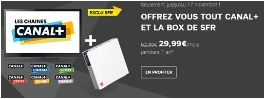 Les nouveaux abonnés à une offre SFR box avec option TV profitent d’une remise exceptionnelle sur l’option les chaînes Canal +. L’offre SFR Box avec Canal + est proposé à partir de 36.99€ au lieu de 69.89€ pendant 1 an entre le 21 octobre et 17 novembre prochain. La promotion est valable pour tous les clients non abonnés au cours des 6 derniers mois à la chaîne Canal + ou Canal Sat. Le changement de formule au cours des 12 premiers mois entraine la perte du prix promotionnel. En cumulant les remises sur les chaînes Canal +, sur l'abonnement ADSL, et la remise multipack pour les abonnés SFR Mobile, vous profitez d'une offre à partir de 26.99€. En effet, SFR vous offre 10€ sur les offres Box pendant 12 mois, 10€ supplémentaires pour les abonnés SFR Mobile et les chaines Canal + à 17€ pendant 12 mois au lieu de 39.90€.