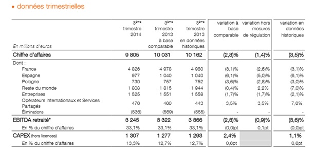 Le chiffre d’affaires s’élève à 9,805 milliards d’euros au 3ème trimestre 2014, en baisse de -2,3% à base comparable. Hors mesures de régulation, l'amélioration progressive de l'évolution du chiffre d'affaires se confirme depuis le début de l'année, avec une baisse limitée à -1,4% au 3ème trimestre après -2,3% au 2ème trimestre, -3,0% au 1er trimestre et -3,8% au 4ème trimestre 2013. L'amélioration au 3ème trimestre comme sur les neuf premiers mois de l'année concerne principalement la France, la Belgique et le secteur Entreprises, tandis que la zone Afrique Moyen-Orient poursuit sa croissance soutenue.