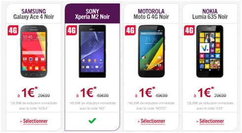 - Le Sony Xperia M2 est au prix de 49.99€ soit 1€ avec la réduction de 48.99€ lors de l’inscription à un forfait iDOL M , le code à renseigner est «M2»