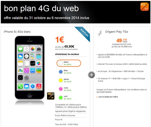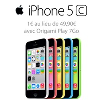 L’iPhone 5C 8Go est à 1€ au lieu de 49.90€ grâce à la vente flash proposé par Orange jusqu'au 06 Novembre prochain. La réduction pour l'achat de cet Apple est valable pour toute souscription via Internet au forfait Origami Play 7Go 4G à 49.99€ chez Orange. Cet abonnement est en promo jusqu'au 19 novembre prochain à 49.99€ au lieu de 54.99€ avec un engagement de 24 mois. Le forfait est disponible avec un engagement de 12 mois à 55.99€ au lieu de 60.99€, et l’iPhone 5C 8Go est au prix de 71€ au lieu de 119.90€.