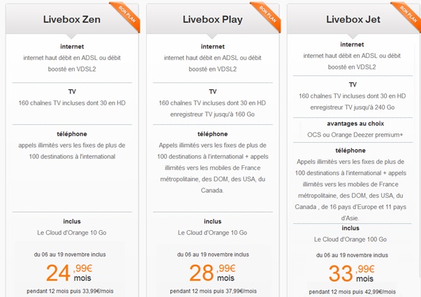 - La Livebox Zen au prix de 33.99€ est en promo pendant 12 mois jusqu’au 19 novembre prochain au prix de 24.99€. Cet abonnement intègre un accès Internet jusqu’à 15 Méga en ADSL ou 50méga en VDSL2, les appels illimités vers les fixes en France et vers les fixes de plus de 100 destinations, et la télévision numérique, jusqu’à 160 chaînes incluses ainsi que le cloud d’Orange 10Go.