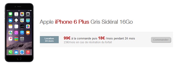 L’iPhone 6 Plus vient d’être ajouté à la gamme des Smartphones proposés en location à 99€ à la commande puis 18€ par mois pendant 24 mois. Dans le cas où vous résiliez votre forfait mobile avant les 24 mois, le tarif passera à 23€.