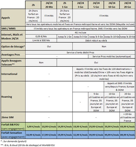 La gamme sera composée de 7 forfaits mobiles sans engagement, et on note que la marque B&You sera tout de même conservée. Les offres sans engagement démarrent à 3.99€ avec 2h d’appels jusqu’au forfait illimité avec 20Go de data à 69.99€. Des nouveaux forfaits apparaissent avec plus de data cependant les prix des offres actuelles augmentent comme le forfait 2h à 2.99€ qui passe à 3.99€ et le forfait 24/24 + 20/Mo passe de 9.99€ à 10.99€, le forfait 24/24 + 5Go quant à lui passe de 24.99€ à 29.99€. On note également que le prix de la minute en hors forfait double et passe de 0.10€ à 0.20€ par min pour les formules avec 2h d'appels.