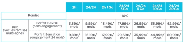 L’opérateur vous offre une remise de 10% à partir de 2 forfaits mobiles, cette réduction est valable pour toutes les offres avec ou sans engagement.