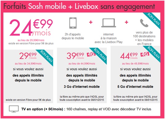 -Le forfait Livebox + Mobile 24/24 à 34.99€ au lieu de 39.99€ comprend un accès Internet avec les appels illimités vers les fixes et les mobiles en France et vers les fixes de plus de 100 destinations internationales ainsi qu’un forfait mobile avec les appels, SMS et MMS illimités en France et vers les DOM. Cette offre est disponible sans la TV à 34.99€ soit 29.99€ avec la promotion.