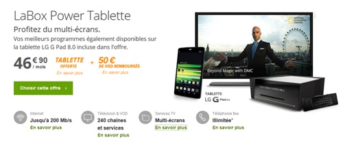 Numericable vous offre la LG G Pad 8.0 pour toute souscription à l’abonnement très haut débit Box Power + tablette à 46.90€ par mois. De plus, l’opérateur vous rembourse 50€ de VOD jusqu’au 18 janvier 2015 ainsi que les frais de mise en service et frais de port.