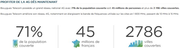 Bouygues Telecom est le numéro 1 pour la couverture mobile 4G en France en nombre de villes et en vitesse de navigation selon 4G Monitor en octobre 2014. A ex aequo avec Orange, l’opérateur couvre 71% de la population 18 novembre 2011. La 4G est accessible dans 2786 villes et 6324 sites 4G sont en service au 01 novembre 2014 selon la déclaration à l’ANFR.