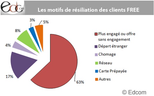 Les forfaits mobiles Free sont des offres sans engagement, c’est donc la principale raison des résiliations chez Free à 63%. Les clients Free Mobile peuvent donc à tout moment résilier leur abonnement téléphonique sans frais. Le 2éme motif est la résiliation pour départ à l'étranger avec 17% des abonnés. La résiliation pour motif de réseau qui a diminué entre Juillet et Juin de 10% à 8%, reste stable en Août 2014 avec 8% des abonnés qui résilient pour incident de réseau. Pour rappel l’opérateur utilise son propre réseau sur 45% du territoire français et le reste est assuré par le réseau Orange.
