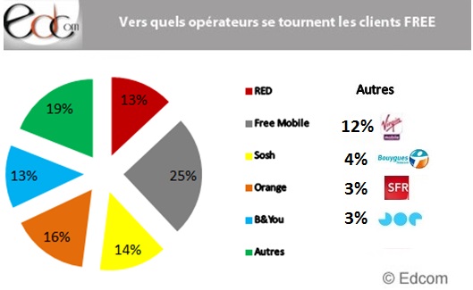 Pour 25% des clients, ils retournent chez leur opérateur, en l’occurrence Free Mobile. Bien que le changement d’offre soit possible depuis le mois d’Avril 2013, ils sont encore nombreux à résilier pour revenir chez Free. En effet, les abonnés à une offre illimitée depuis au moins 3 mois peuvent changer vers le forfait mobile à 2€ à tout moment depuis leur espace client mais facturée 10€ ce qui freine encore un certain nombre.