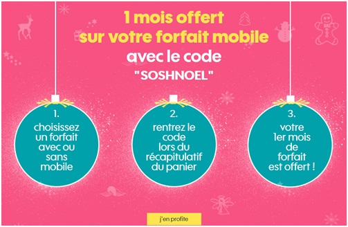 Pour profiter du mois offert, vous devez souscrire à un forfait Sosh sans engagement à partir de 4.99€ et indiquer lors de l’inscription le code promo « SOSHNOEL ». La remise est appliquée sur la première facture et valable pour toute souscription entre le 01 et 15 décembre 2014.