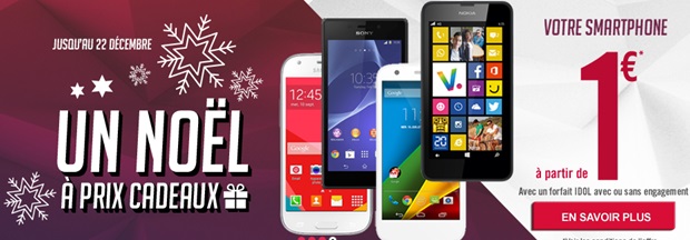 Jusqu’au 22 décembre, Virgin Mobile met en avant une sélection de Smartphones à 1€ en ajoutant l’option mobile à 4€ par mois avec un forfait mobile sans engagement. Les portables concernés par l’opération sont le Nokia Lumia 635, l’Alcatel One Touch Pop C7, le Sony Xperia E1 ou encore le Huawei Y330 et le Samsung Galaxy Trend Lite.