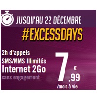 L’opération #Excessdays lancée le 04 décembre dernier valable jusqu’au 18 décembre 2014 puis prolongée jusqu’au 22 décembre 2014 touche à sa fin. ll vous reste encore quelques heures pour profiter de cette offre exceptionnelle disponible via internet sur le site Virgin Mobile.