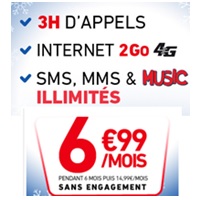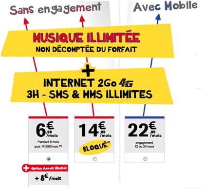 Cette offre est proposée sans engagement au prix de 6.99€ pendant 6 mois au lieu de 14.99€ jusqu’au 17 janvier 2015. L’abonnement est disponible en version bloquée sans engagement au prix de 14.99€. Avec l’achat d’un Smartphone, l’opérateur propose cette formule avec engagement de 12 ou 24 mois au prix de 22.99€. Une option appels illimités à 8€ par mois peut être ajoutée au moment de la souscription avec ce forfait Music (non compatible avec la version bloquée).
