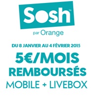 Sosh vient de prolonger la remise de 5€ par mois valable tout au long de l’abonnement avec les toutes les formules Livebox et mobile. La réduction est disponible pour toute souscription entre le 08 janvier et 04 février prochain et réservée aux clients Sosh Mobile(non disponible pour les clients déjà abonnés internet Orange). Grâce à cette promotion, les offres Quadrupleplay démarrent à 29.99€ par mois avec l’option TV disponible sans la TV soit à partir de 24.99€. Pour bénéficier de l'offre de remboursement vous devez souscrire à l’une des offres Livebox et mobile puis compléter et renvoyer ce coupon.