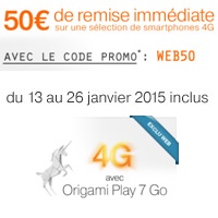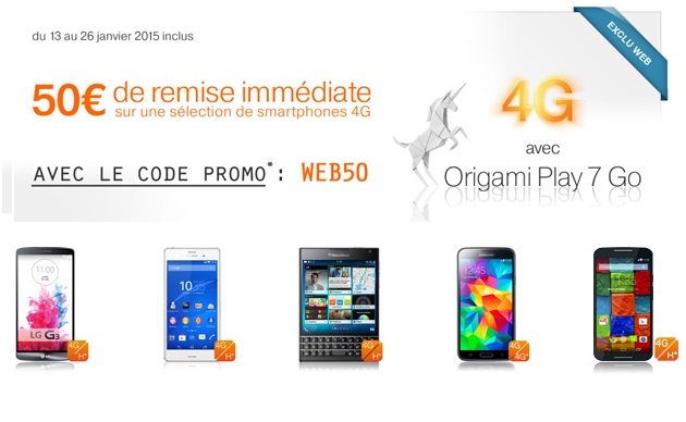 En exclusivité WEB et jusqu'au 26 janvier 2015, renseignez au moment de votre commande le code WEB50, dans le champ prévu à cet effet et 50€ seront déduits du prix de votre smartphone 4G parmi la liste des terminaux ci-dessous :