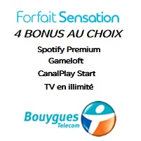 Les abonnés Bouygues Telecom à un forfait Sensation 5Go et plus profitent dès le 19 janvier sans aucun surcoût des services Spotify Premium, Gameloft, CanalPlay Start ou la TV en illimité et dès le 23mars pour tous les clients d’un forfait Sensation avec 3Go et plus. Pour en profiter, il suffira au client de choisir et d’activer 1 bonus parmi les nouveaux services via son espace client avec la possibilité de le modifier chaque mois dès la fin Mars. Les usages data liés à l’utilisation de ces services seront décomptés de l’enveloppe internet du forfait du client (exception faite du bonus TV en illimité).