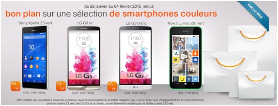 1/Le Sony Xperia Z3 Vert est proposé à 199.99€ au lieu de 249.99€ avec la souscription au forfait Origami Play 3Go en 4G.