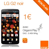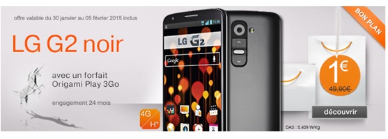 Le LG G2 est à 1€ au lieu de 49.90€ grâce à la vente flash proposée par Orange jusqu'au 05 février prochain. La réduction de 48.90€ est immédiate et valable pour toute souscription à un forfait Origami Play 3Go au prix de 42.99€ avec un engagement de 24 mois chez Orange.