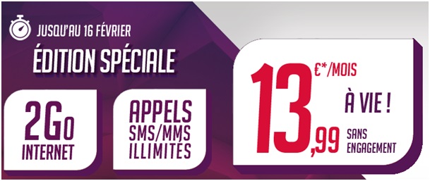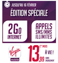 Virgin Mobile propose une nouvelle édition spéciale sans engagement valable jusqu’au 16 février prochain. Cette offre comprend les appels, SMS et MMS illimités et un accès Internet de 2Go en H+ grâce à l’option dooble data à 5€ par mois offerte, le débit est réduit au-delà du volume autorisé. Cette offre exceptionnelle est sans engagement et au prix de 13.99€ valable à vie. Pour éviter tout dépassement et maitriser ainsi votre budget, il est possible d’ajouter une option cockpit facturée 3€ par mois soit le forfait Edition Spéciale illimité + 2Go à 16.99€ par mois.