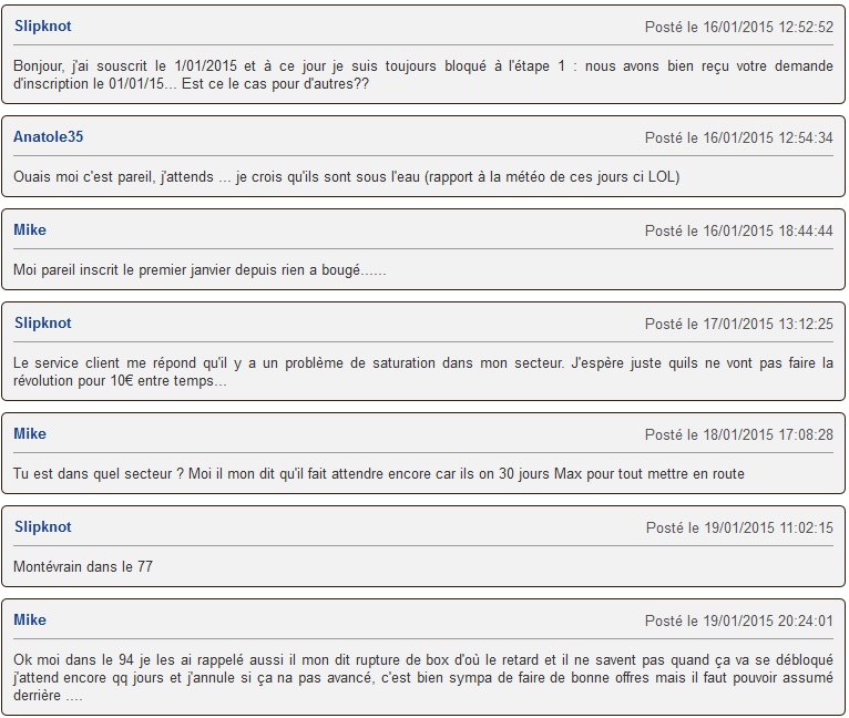Nous n’avons bien évidemment pas le chiffres concernant le recrutement de nouveaux abonnés lié à cette vente privée freebox mais une chose est certaine, (après avoir recueilli différents témoignages par téléphone et via nos commentaires d'actualités) beaucoup d’entre eux sont aujourd’hui déçus de n’avoir aucune nouvelle depuis le jour de leur inscription. Ces mêmes personnes se retrouvent malheureusement un peu démunies et bloquées à l’étape 1/6 de leur commande. Voici quelques commentaires déposés sur notre site qui peuvent vous donner une idée des plaintes des consommateurs ... Si vous effectuez des recherches sur le web (forums), vous vous rendrez vite compte que c'est la même chose pour beaucoup de nouveaux abonnés freebox issus de la vente privée (forum universfreebox)