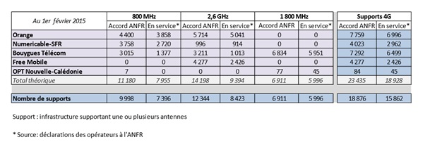 Au 1er février 2015, 18876 sites ont été autorisés pour la téléphonie mobile 4G tous opérateurs mobiles confondus. Ce chiffre est en hausse de 2.8% depuis le 01 janvier 2015.