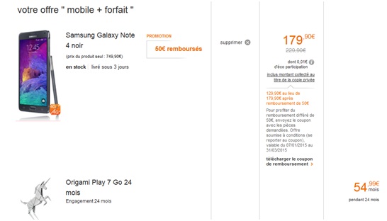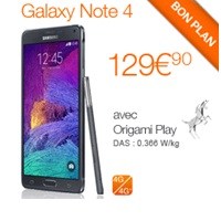 Pour l’achat du Galaxy Note 4, Orange vous offre une remise immédiate de 50€ lors de l’inscription, vous profitez également d’une réduction différée de 50€ par le constructeur Samsung. Pour bénéficier de ces deux remises, vous devez souscrire à un forfait Origami Play 7Go à 54.99€ avec engagement de 24mois. La promotion immédiate de 50€ est valable jusqu’au 12 février prochain soit le mobile à 179.90€ à la commande et le mobile vous revient à 129.90€ avec la remise différée de 50€ disponible jusqu’au 31 Mars 2015.