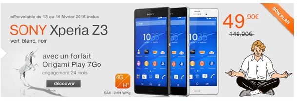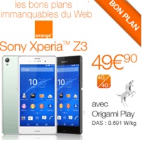 Pour l’achat du Sony Xperia Z3 disponible en coloris vert, blanc ou Noir, Orange vous offre une remise immédiate de 50€ lors de l’inscription, vous profitez également d’une réduction différée de 50€. Pour bénéficier de ces deux remises, vous devez souscrire à un forfait Origami Play 7Go à 54.99€ avec engagement de 24mois. La promotion immédiate de 50€ est valable jusqu’au 19 février prochain soit le mobile à 99.90€ à la commande. Le mobile vous revient à 49.90€ avec la remise différée de 50€ disponible jusqu’au 01 Avril 2015 chez Orange.