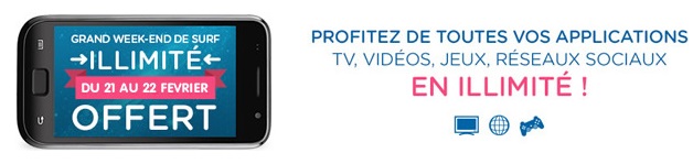 Tous les abonnés à une offre B&You sans engagement ou forfait Sensation chez Bouygues Telecom peuvent bénéficier du surf en illimité tout le Week-end. Pour en bénéficier, il vous suffit d’éteindre et de rallumer votre téléphone samedi 00h01. Vous profitez d’un accès à Internet en illimité depuis votre Smartphone, du samedi 21 Février 00h01 au dimanche 22 Février 23h59.