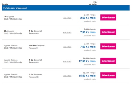 Toutes les offres sans engagement intègrent les SMS et MMS illimités en France avec 2h d’appels ou les appels illimités en France en fonction du forfait choisi. Les usages data varient entre 100Mo et 2Go par mois, et vous profitez du réseau 4G avec la formule avec 2Go de data.
