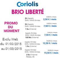 Les forfaits sans engagement Brio Liberté sont en promotion jusqu’au 01 Mars prochain. Il ne vous reste donc plus que 3 jours pour en profiter. Les remises allant de 1€ à 3€ par mois sont valables pour toute souscription à une offre sans engagement chez Coriolis et ce pendant 6 mois. En cas de changement de formule vers un forfait Coriolis avec engagement, la remise est perdue.