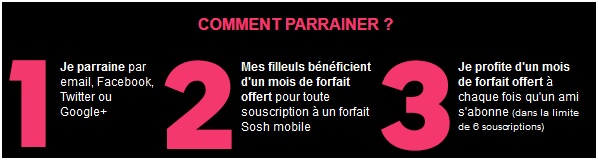 Opération de parrainage par Sosh ouverte en France métropolitaine à compter du 06/03/2015 et qui restera en place de manière définitive pour toute souscription sur le web à l'une des offres mobiles ou mobile + livebox. Opération valable entre deux individus distincts. Le parrain doit être détenteur d'une offre Sosh mobile ou Sosh mobile + Livebox souscrite au minimum 1 mois avant le début de l'opération de parrainage.
