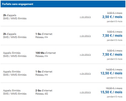 Le forfait 2H SMS et MMS illimités + 1Go est à 7.50€ pendant 6 mois au lieu de 9.50€ et comprend 2h de communication par mois ainsi que les SMS et MMS illimités et un accès Internet avec un volume de 1Go par mois en H+ (débit réduit-au-delà),