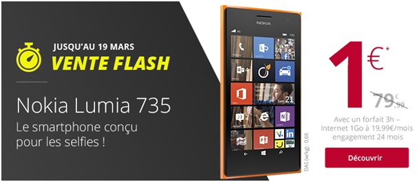 Le Nokia Lumia 735 est en vente flash chez Virgin Mobile jusqu’au 19 Mars prochain. Une remise immédiate de 48.90€ est appliquée à la commande pour toute souscription à un forfait 3h + 1Go ou un forfait appels illimités + 100Mo avec engagement de 24 mois au prix de 19.99€. L’opérateur vous rembourse également jusqu’à 30€ pour l’achat de ce Smartphone jusqu’au 14 Avril prochain.