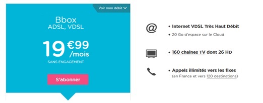 Pour ceux qui ne sont pas éligibles à la Fibre, Bouygues Telecom commercialise des offres par ADSL à partir de 19.99€ par mois.
