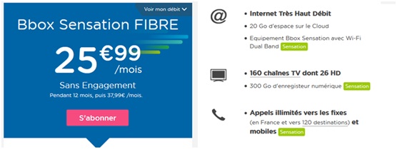 - La Bbox Sensation Fibre FTTH jusqu’à 1Gb/s pour les raccordements en fibre jusqu’au domicile est au prix de 25.99€ par mois sans promo est disponible pour le moment à Paris et certaines villes en région parisienne, Lyon, Marseille, Toulouse, Nice et Bordeaux.