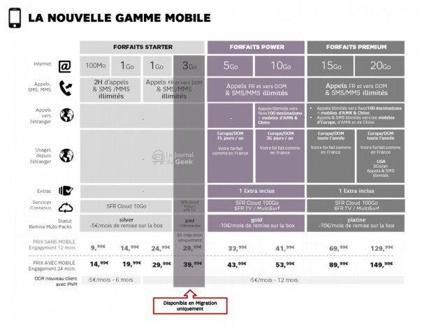 - La gamme Power sera composée de 2 forfaits à partir de 33.99€ avec engagement de 12 mois et sans mobile ou encore 43.99 avec achat de Smartphone et engagement de 24 mois. Ces deux offres intègrent les appels, SMS et MMS illimités ainsi qu’un accès Internet avec des volumes de 5Go ou 10Go en fonction de l’offre choisie et du Roaming et un extra SFR au choix.