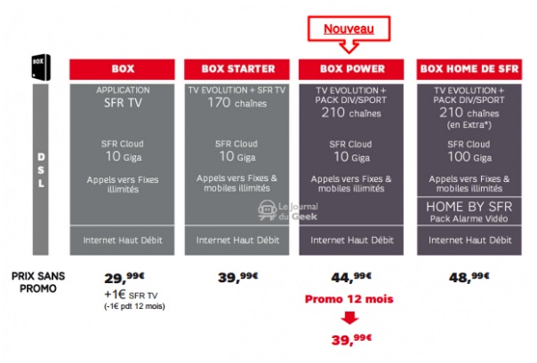 La TV sur Smartphone PC et tablette facturée 1€ par mois est obligatoire depuis le 17 Mars pour les abonnés à une Box de SFR non détenteurs d’une option TV, il faudra donc débourser 1€ de plus sur les offres ADSL/VDSL soit à partir de 30.99€ par mois, l’opérateur offrira cette option pendant 1 an. Les autres formules avec TV augmentent également de prix au 01 Avril 2015, la formule ADSL avec TV Evolution sera proposée à partir de 39.99€ soit une augmentation de 5€ par mois par rapport aux offres actuelles. La TV classique et TV par Google Play ne seront plus disponibles chez SFR, cependant les services TV évoluent avec plus de chaines avec l’abonnement Power à 44.99€ par mois.