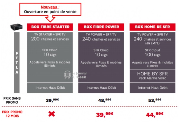Les offres Fibres seront proposées à partir de 39.99€ par mois pour la Box Fibre Starter, 48.99€ pour la Box Fibre Power et 53.99€ pour la Box Home de SFR, les prix sont indiqués sans tenir compte des offres promotionnelles.
