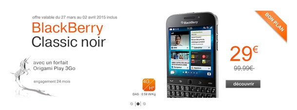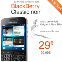 Le BlackBerry Classic est en vente flash en exclu Web chez Orange entre le 27Mars et 02 Avril prochain. Grâce à la remise immédiate de 70€ proposée par Orange, ce Smartphone vous revient à 29.90€ au lieu de 99.90€. La réduction est valable pour toute souscription à un forfait Origami Play 3Go au prix de 42.99€ par mois avec engagement de 24mois.