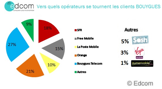 Orange est comme pour le mois de décembre 2014, l’opérateur qui récupère le plus d’abonnés Bouygues Telecom en Janvier 2015 avec 21% et 5% se dirigent vers la marque Low Cost Sosh soit 25% des clients Bouygues se tournent vers l'opérateur historique contre 24% le mois précédent.