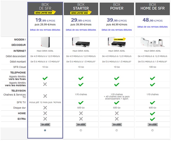 La Box Home de SFR est quant à elle au prix de 48.99€ par mois avec la TV Evolution sinon au prix de 44.99€. Cet abonnement intègre un accès internet Haut Débit incluant SFR Cloud 100Go ainsi que les appels illimités vers les fixes de plus de 100 destinations et les appels vers les mobiles en France métropolitaine et DOM. Un Extra au choix est proposé parmi le Pack 3 VOD, Pack Divertissement + Sport et Pack Jeunesse ou Appels illimités vers les mobiles d’Europe.