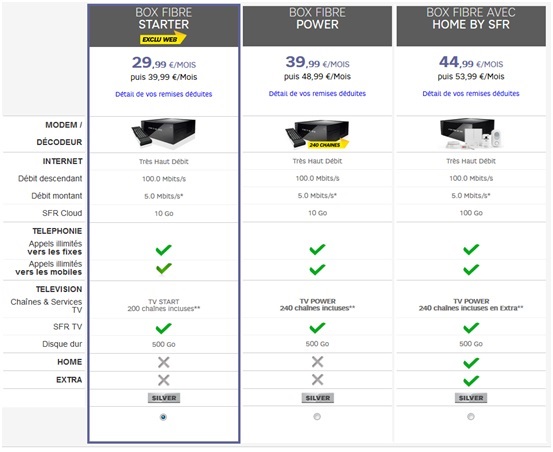 Les offres Fibres intègrent toutes un accès Internet très haut débit avec un débit qui varie entre 30Mb/s et 1Gb/s en fonction de la zone géographique ainsi que les appels illimités vers les fixes et les mobiles en France et vers les fixes de plus de 100 destinations internationales. SFR cloud avec les formules Starter et Power et 100Go pour la formule Home.