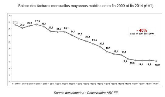 Depuis l’attribution de la 4ème licence d’opérateur à Free Mobile fin 2009, les factures mensuelles moyennes des consommateurs français ont baissé de 40%