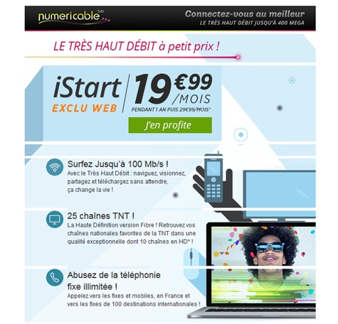L’offre iStart en exclu Web est en promo pour toute souscription entre le 30 Mars 2014 et 07 juin prochain. Numericable vous offre 10€ de remise et ce pendant 12 mois sur l’abonnement soit une offre fibre avec téléphonie illimitée et les chaînes de la TNT à 19.99€ au lieu de 29.99€ par mois. De plus, les frais d’accès au service facturés 50€ sont offerts pour toute commande via le site de Numericable. Dans le cadre d’un changement de fournisseur d’accès à Internet, le leader du très haut débit en France vous rembourse jusqu’à 100€ sur vos frais de résiliation de votre ancien abonnement. L’abonnement iStart est soumis à un engagement de 12 mois avec des frais de résiliation de 50€.